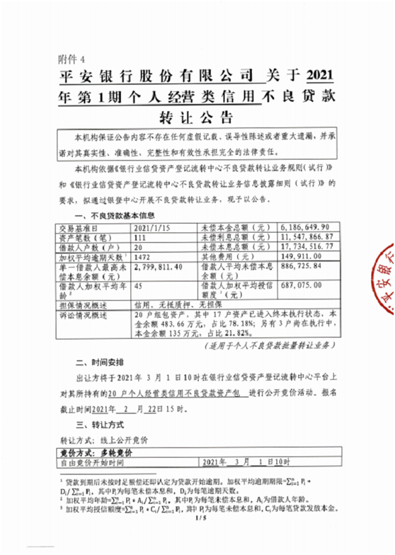 平安銀行首期轉讓的標的即是該行1月25日發(fā)布的《擬轉讓簡介》標的。從轉讓公告中可以看出:該批標的為個人經營類信用不良貸款,共20戶,其中17戶已終本,3戶執(zhí)行中,逾期天數(按未嘗本息總額加權平均)1472天。未嘗本金總額約619萬元,未嘗利息總額約1155萬元,未嘗本息總額約1773萬元,起始價100萬元,加價幅度3萬元。