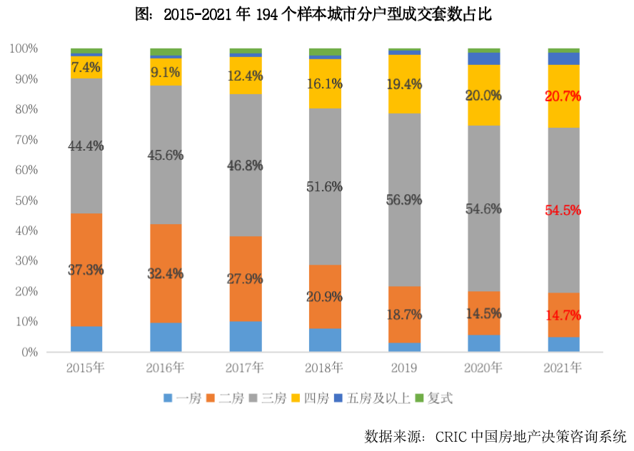 受限貸政策影響,大量改善性需求被壓制。2021年,改善性需求相對(duì)堅(jiān)挺,據(jù)CRIC重點(diǎn)監(jiān)測的 194個(gè)樣本城市成交結(jié)構(gòu)數(shù)據(jù)顯示,三房成交套數(shù)占比高達(dá)54.5%,四房成交占比穩(wěn)步提升至20.7%。但受限貸政策影響,不少城市二套房首付比例都在50%以上,部分城市更是達(dá)到70%乃至80%,很大程度上提升了改善性客群首付款支出壓力,大量改善性需求被壓制。