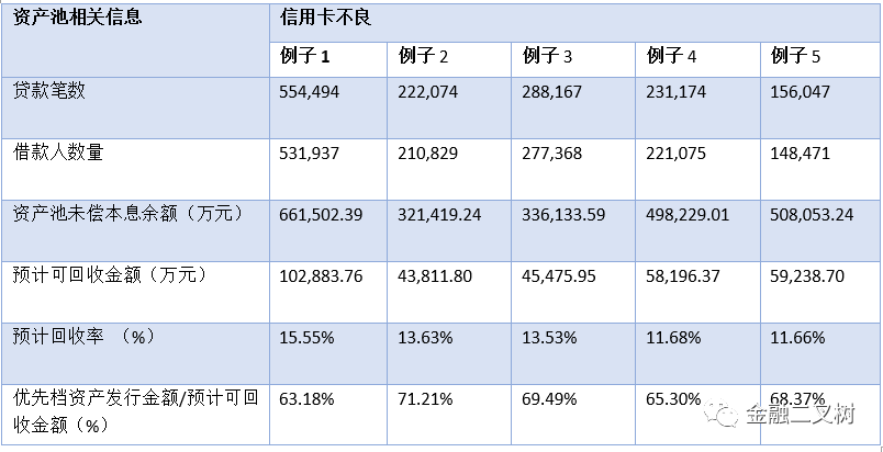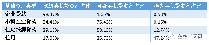 不良ABS根據(jù)基礎(chǔ)資產(chǎn)不同可以分為信用卡類、企業(yè)貸款類、小微企業(yè)貸款類、住房抵押貸款類、個人汽車貸款類、一般消費(fèi)貸款類和混合貸款類。在這幾種資產(chǎn)中信用卡類是被認(rèn)為分散度最高的,這是由于信用卡類客戶以及貸款性質(zhì)決定的,這類ABS入池貸款筆數(shù)相較其他類ABS是最多的,每筆規(guī)模也普遍較小,以下表為例: