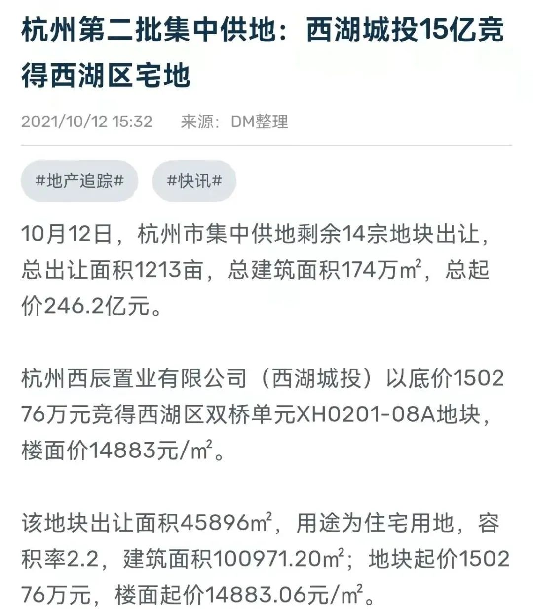 2021年10月12日,西湖城投的子公司杭州西辰置業(yè)有限公司以150276萬(wàn)元的價(jià)格摘得杭州市西湖區(qū)總出讓面積為45896平方米的商住地。