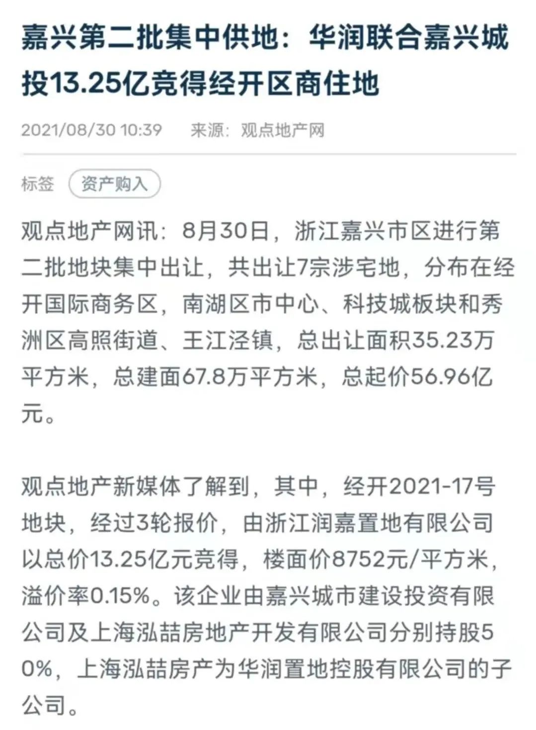 2021年8月30日,嘉興城市建設(shè)投資有限公司的子公司聯(lián)合華潤(rùn)置地,以13.25億元的價(jià)格摘得嘉興市區(qū)總出讓面積為35.23萬(wàn)平方米的商住地。