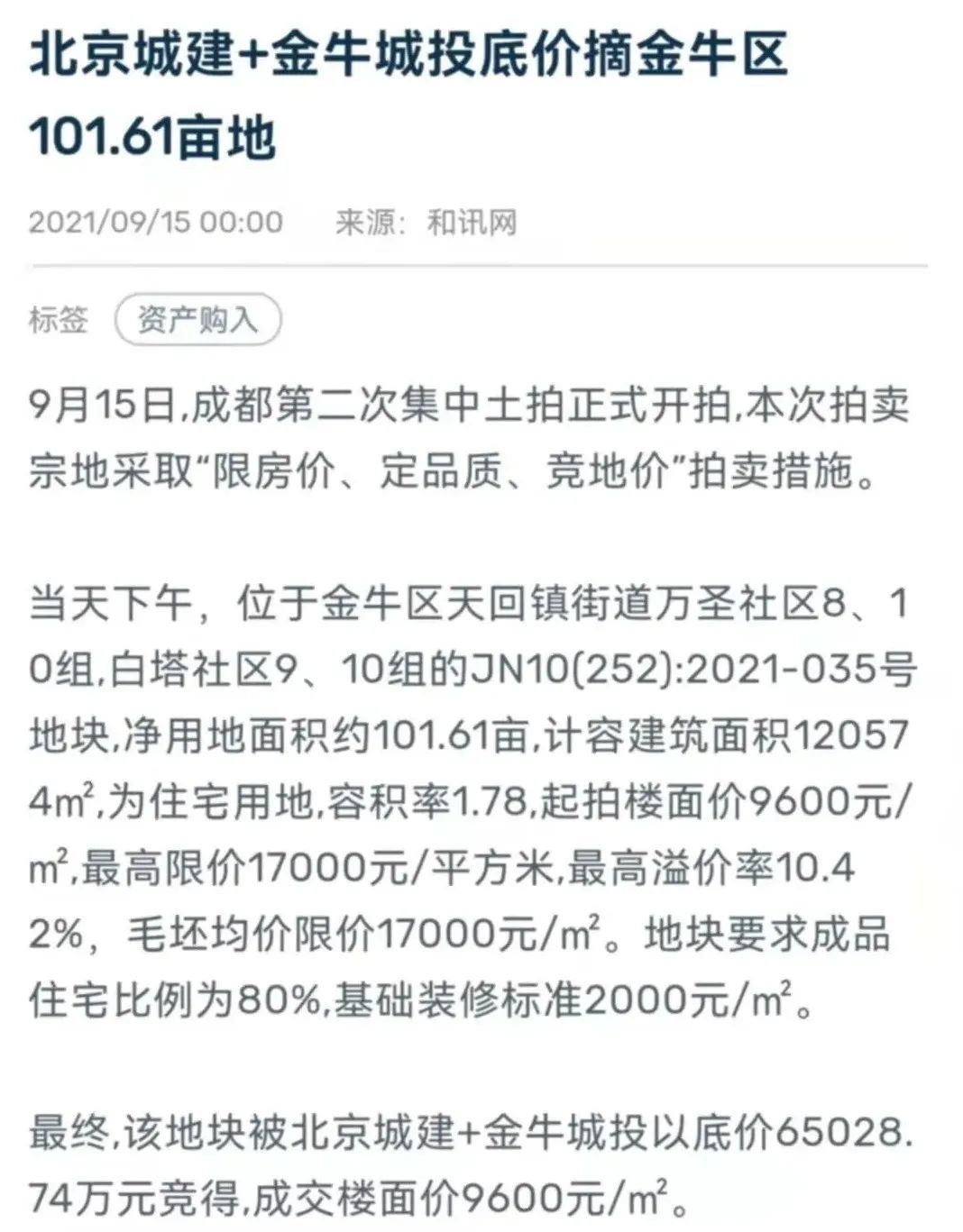 2021年9月15日,北京城建和金牛城投合作以65028.74萬(wàn)元的價(jià)格摘得成都市金牛區(qū)凈用地面積為101.61畝的住宅用地。