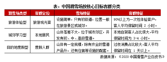 冰雪場地主要涵蓋滑冰場與滑雪場等形態(tài),由于當(dāng)前新增滑冰場多為商業(yè)綜合體形式,基本交由冰場品牌方進行承租運營(少數(shù)由商業(yè)體自建并自主運營,如華潤旗下的冰紛萬象系列),所以暫不在本文的參照范圍內(nèi)。國內(nèi)滑雪場按核心目標客群可分為三類:旅游體驗型、城郊學(xué)習(xí)型及目的地度假型,據(jù)《2020中國滑雪產(chǎn)業(yè)白皮書》數(shù)據(jù)顯示三類雪場占比75%、22%及3%,新建雪場中目的地滑雪度假區(qū)呈上升趨勢,而旅游體驗型滑雪場則出現(xiàn)下滑趨勢。