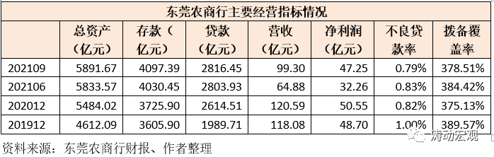 截至2021年9月,東莞農(nóng)商行的總資產(chǎn)達(dá)到5891.67億元,不良貸款率與撥備覆蓋率分別為0.79%與378.51%。目前東莞農(nóng)商行按總資產(chǎn)排序位居第五大農(nóng)商行,低于重慶農(nóng)商行、上海農(nóng)商行、北京農(nóng)商行、廣州農(nóng)商行。