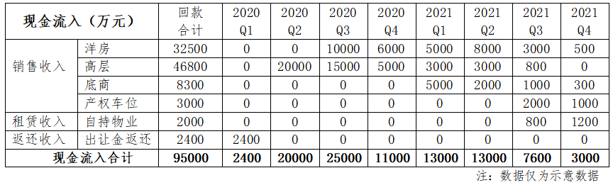 就項目本身來說,現金流入體現的是每一時刻下的流入項合計,即銷售回款流入、經營租賃流入和政策返還類流入合計;聯動的各項基礎數據包括業(yè)態(tài)指標、銷售單價與去化、回款等。