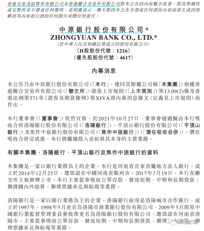 (一)中原銀行擬吸收合并洛陽銀行、平頂山銀行、焦作中旅銀行三家銀行