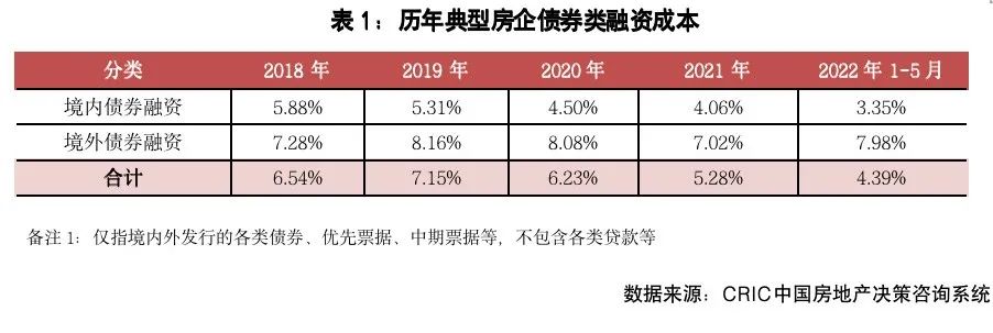 2、融資成本:2022年1-5月100家典型房企新增債券類1融資成本4.39%,較2021年全年下降0.89個百分點,其中境外債券融資成本7.98%,較2021年全年上升0.96個百分點,境內債券融資成本3.35%,較2021年全年下降0.71個百分點。單月來看,5月房企融資成本4.81%,環比上升1.55pct,同比下降0.4pct。其中境內融資成本3.73%,環比上升0.5pct,發債主體仍是集中在中海、保利發展、華潤置地等國企央企,但是相較于4月而言發債企業的數量以及債券發行的規模均有所減少;境外融資成本10.38%,環比大幅提升了6.58pct,主要是因為上個月僅有遠洋集團發行了一筆成本較低的綠色債券,而本月由于中梁和大唐因為交換要約而發行了3筆優先票據,融資成本都相對較高。
