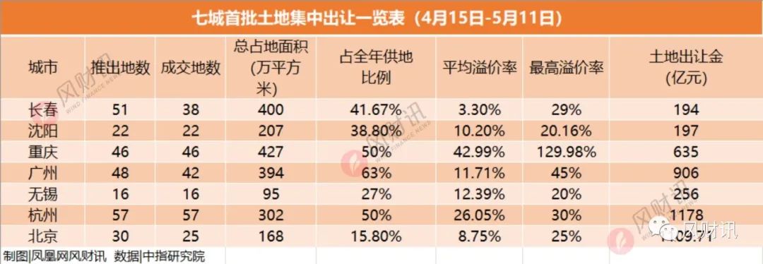 4月15日-5月11日,長春、沈陽、重慶、廣州、無錫、杭州、北京完成了首批土地集中入市的拍賣。