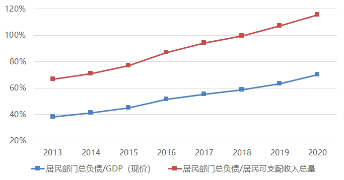 居民部門總負(fù)債與GDP/居民可支配收入總量的比值(2013年-2020年)