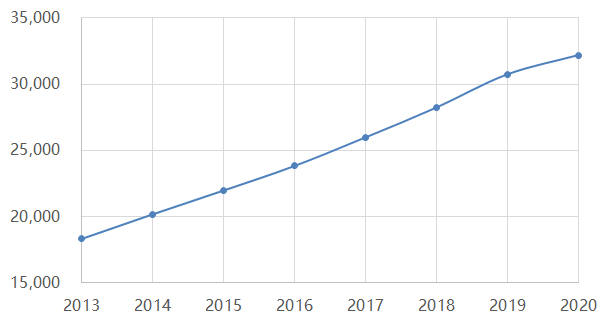 居民可支配收入總量數(shù)據(jù)從2018年以后已不再公布,但仍在持續(xù)公布人均可支配收入數(shù)據(jù)。2018年之前的過去數(shù)年,居民可支配收入占GDP比重比例較為穩(wěn)定,人均可支配收入與人口數(shù)乘積(居民可支配收入計(jì)算值)相比國家統(tǒng)計(jì)局公布的居民可支配收入總量的比例也相對(duì)穩(wěn)定。因此筆者采用了二者取其一,利用另一者校驗(yàn)的方法進(jìn)行居民可支配收入總量數(shù)據(jù)的假設(shè)測(cè)算;