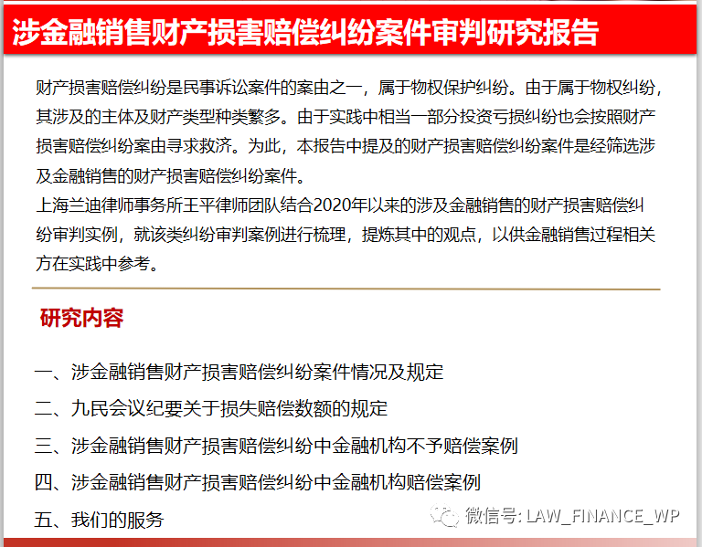 上海蘭迪律師事務(wù)所王平律師團(tuán)隊(duì)結(jié)合2020年以來(lái)的涉及金融銷(xiāo)售的財(cái)產(chǎn)損害賠償糾紛審判實(shí)例,就該類(lèi)糾紛審判案例進(jìn)行梳理,提煉其中的裁判要旨等,以供金融銷(xiāo)售過(guò)程相關(guān)方在實(shí)踐中參考。本次研究的對(duì)象為自2020年以來(lái)涉及金融銷(xiāo)售的財(cái)產(chǎn)損害賠償糾紛司法案件判決書(shū)。