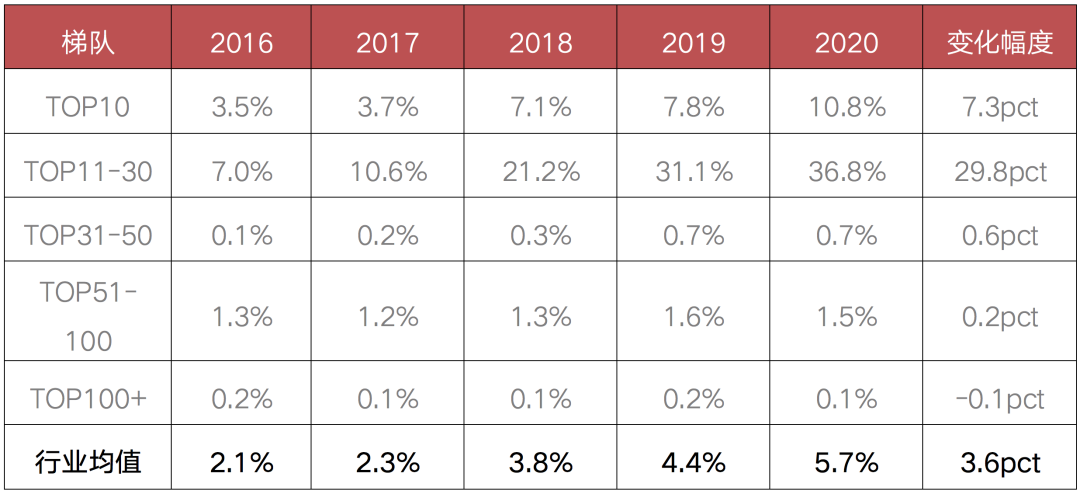 表:2016-2020年不同規(guī)模梯隊(duì)房企的