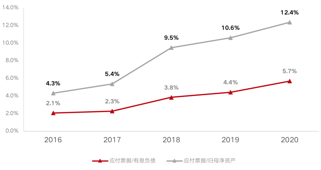 應(yīng)付票據(jù)/有息負(fù)債以及應(yīng)付票據(jù)/歸母凈資產(chǎn)(單位:%)