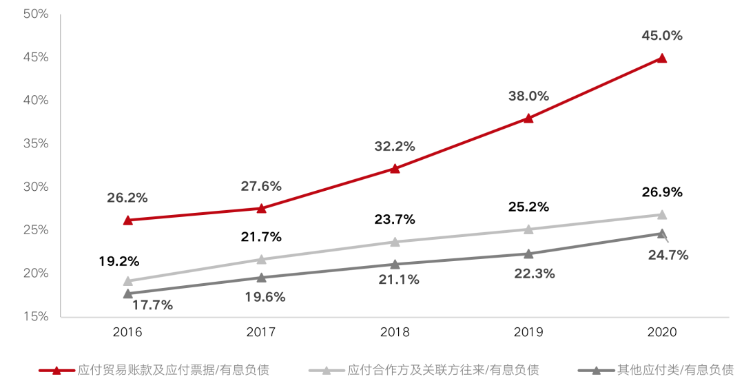 三項(xiàng)應(yīng)付類債務(wù)與有息債務(wù)的比例(單位:%)