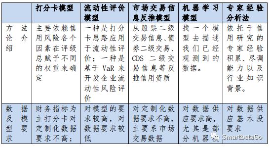 目前市場上提供的信用研究方式,筆者將其歸為五類:第一類,也是主流的是依托于專家經驗的分析法。第二類是以信用風險排序為目的模型(如打分卡模型);第三類是以評價企業(yè)財務狀況為目的財務模型,尤其是測算獲取現金能力和短期風險承受能力的流動性評價模型(如CreditVaR模型);第四類是通過市場交易信息,量化估算企業(yè)違約可能性的模型(如KMV模型,隱含違約率模型,CDS隱含違約率模型等)、第五類是把機器學習應用于信用評估的模型。