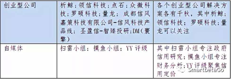 隨著信用債市場違約的爆發(fā),2018年信用債違約120只,涉及金額1176.51億元,創(chuàng)下2014年債券違約元年以來的最高值:數量上,120只與前4年總和(2014年-2017年)122只幾乎持平;規(guī)模上,1177億元比前4年總和860億元高出約36.9%。信用債違約的爆發(fā)一方面催生了買方對信評的崗位需求,另一方面也催生出眾多針對信用債領域的各個方面的解決方案提供商,筆者對這些提供商進行了全市場調研和歸類,如下:
