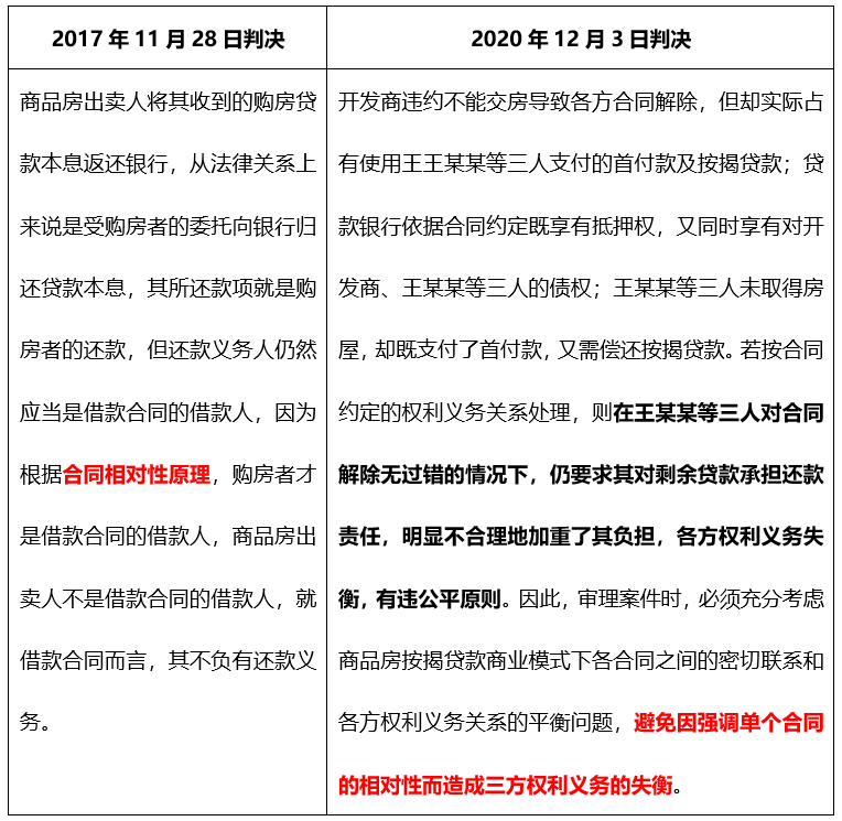 我們同步關(guān)注到,2020年12月3日的判決系經(jīng)最高院審判委員會討論決定,顯然“更具分量”,購房者至此可以舒一口氣:在《商品房買賣合同》解除后,《借款合同》可以一并解除,購房者無需再承擔(dān)剩余貸款還款責(zé)任。