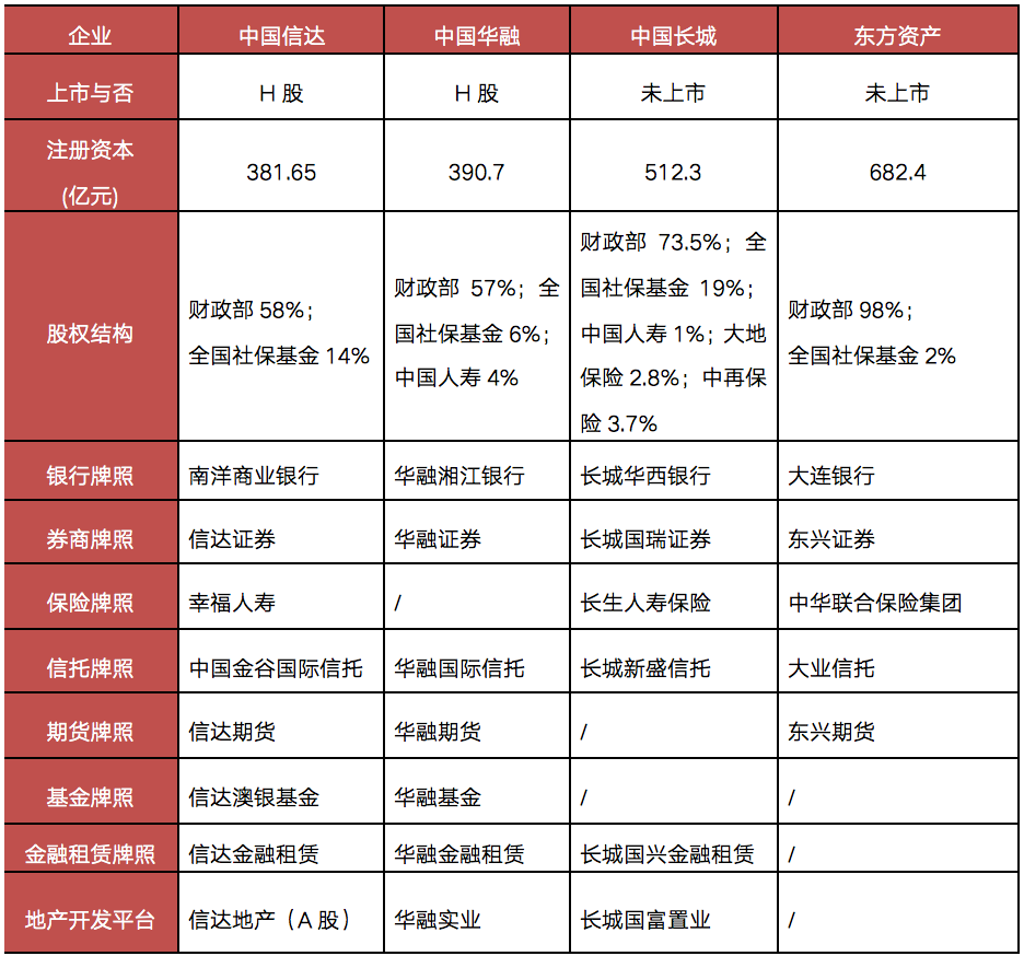 全國性AMC由財政部直接控股,資金實力雄厚(注冊資本大),不良資產(chǎn)管理的經(jīng)營范圍為全國性,主要參與一級市場。發(fā)展到現(xiàn)在,全國性AMC擁有AMC、銀行、證券、保險、基金、金融租賃等多元業(yè)務(wù),逐步轉(zhuǎn)變?yōu)槿普盏慕鹑诳毓杉瘓F,同時還廣泛涉足私募基金、房地產(chǎn)開發(fā)等業(yè)務(wù),地產(chǎn)業(yè)務(wù)平臺上,除東方資產(chǎn)外,中國信達、中國華融和中國長城旗下均設(shè)立房地產(chǎn)開發(fā)平臺。