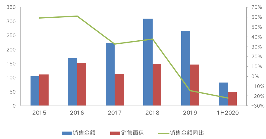 四大AMC地產(chǎn)平臺發(fā)展規(guī)模最大的為中國信達旗下的信達地產(chǎn)。作為中國信達旗下的唯一地產(chǎn)上市平臺,于2015年銷售金額首次實現(xiàn)進入全國房地產(chǎn)銷售百強,總土儲達到487.6萬平方米。2016年由于政策調(diào)控等原因,信達地產(chǎn)項目開發(fā)速度緩慢,2019年全年以及2020上半年權(quán)益銷售金額均呈現(xiàn)負(fù)增長。