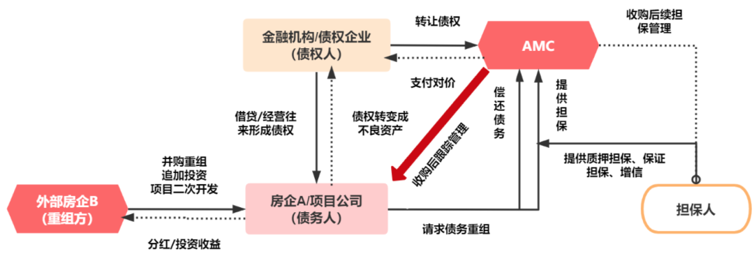 而AMC則可以借助房企進行項目開發(fā),化解自行開發(fā)的局限性,或者在為房企進行融資服務(wù)的過程中,獲取利息收益。