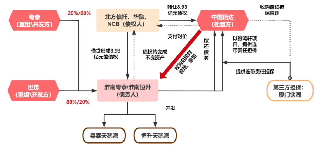 以信達收購粵泰天鵝灣和恒升天鵝灣合計8.93億債權(quán)為例。2019年6月,世茂耗資63.97億元收購粵泰資產(chǎn)包,世茂牽頭引入信達負(fù)責(zé)債務(wù)重組,而項目股權(quán)、開發(fā)和操盤上不發(fā)生變更,依舊由世茂和粵泰共同持股、聯(lián)合開發(fā)。