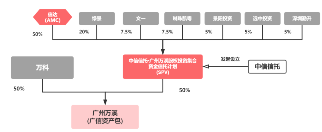 2020年6月萬科發(fā)布《關(guān)于廣信資產(chǎn)包引入戰(zhàn)略合作的公告》,采用“股權(quán)+債權(quán)”的交易方式,將廣信資產(chǎn)包以8.33折(390.4/470.4)出讓50%的權(quán)益予以信達在內(nèi)的七位戰(zhàn)投,整體回籠資金390.4億元。交易完成后,萬科和綠景負(fù)責(zé)廣信資產(chǎn)包的整理與開發(fā),其他五位戰(zhàn)投充當(dāng)財務(wù)投資者。而信達收購廣信資產(chǎn)包25%的權(quán)益,將進行債務(wù)重組、追加投資來盤活不良資產(chǎn),同時作為戰(zhàn)投提供資金的同時,能按照股權(quán)比例獲得相應(yīng)的經(jīng)營收益。
