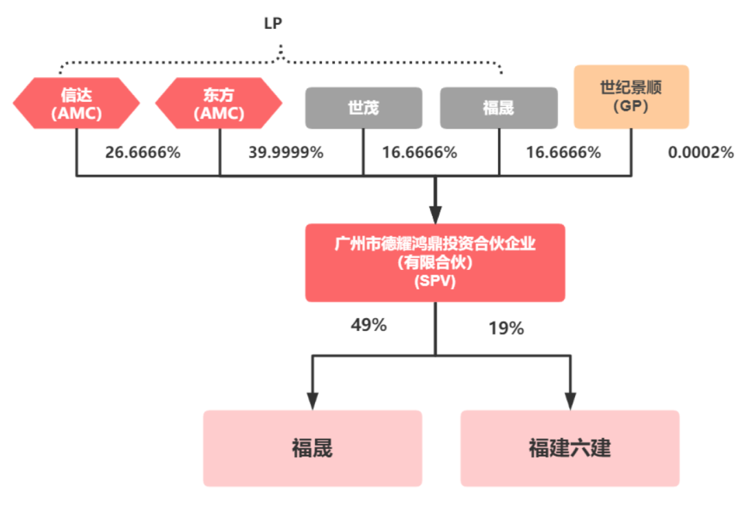 2020年世茂與福晟正式簽訂戰(zhàn)略合作協(xié)議,2020年1月,世茂和福晟聯(lián)合兩家AMC(東方與信達)共同出資設(shè)立德耀鴻鼎,德耀鴻鼎分別受讓福晟49%和福建六建19%的股權(quán)。