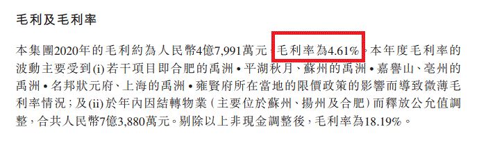 本年度毛利率的波動主要受到若干項目即合肥的禹洲 ? 平湖秋月、蘇州的禹洲 ? 嘉譽山、亳州的禹洲 ? 名邦狀元府、上海的禹洲 ? 雍賢府所在當地的限價政策的影響而導致微薄毛利率情況;及于年內因結轉物業(主要位于蘇州、揚州及合肥)而釋放公允值調整,合共人民幣7億3,880萬元。剔除以上非現金調整后,毛利率為18.19%。