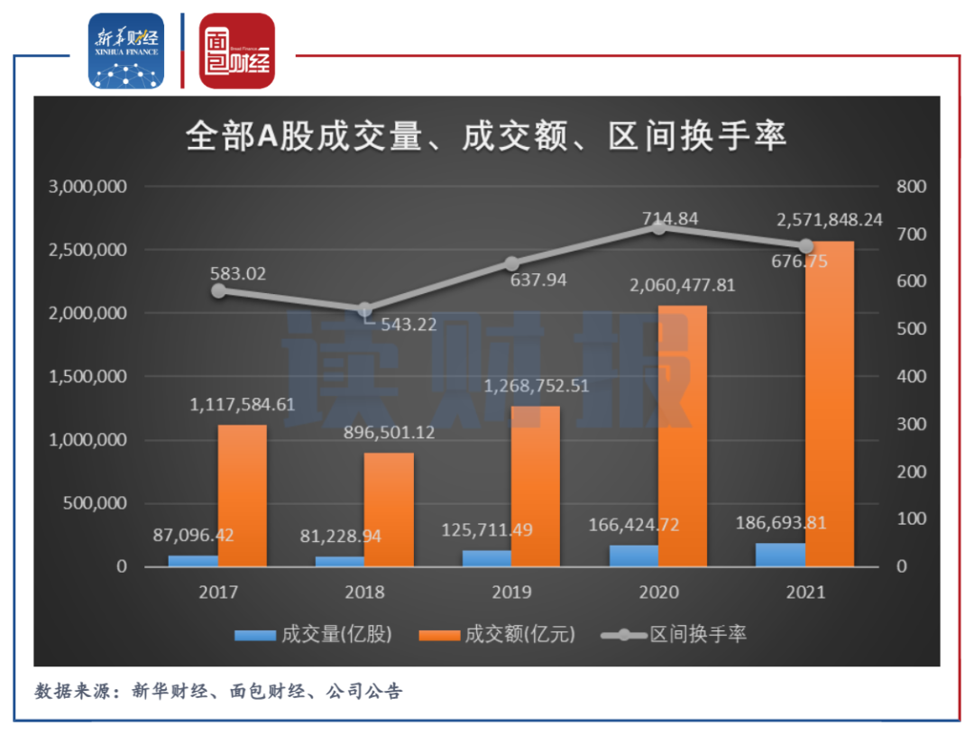 數據統計顯示,2021年全部A股的總成交量和總成交額分別為18.67萬億股和257.18萬億元,分別同比增加12.18%和24.82%。當期A股的區間換手率雖較上年有所下滑,但總體仍保持較高的水平,結合成交量和成交額雙增長,2021年A股整體交投較活躍,這或是促使券商業績普遍增長的原因之一。