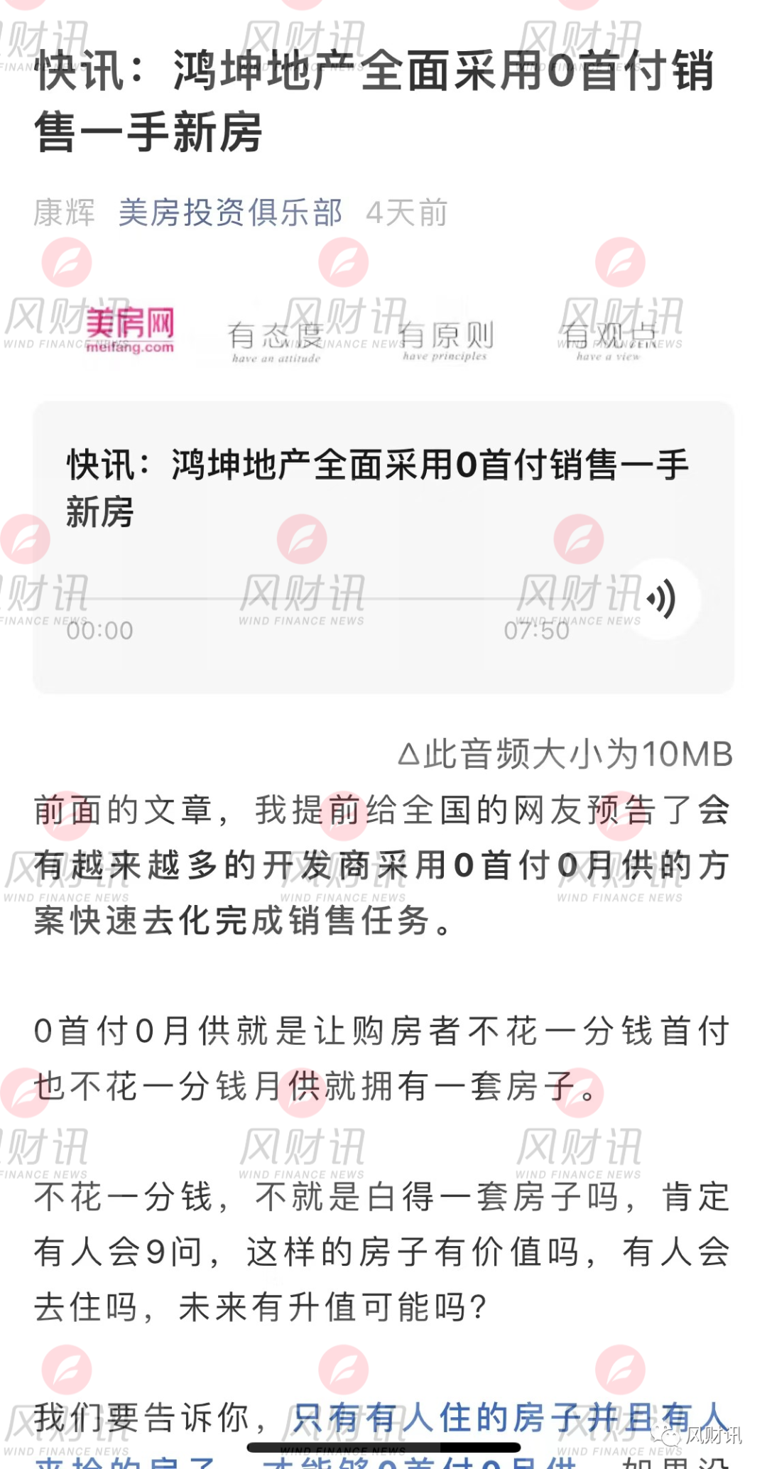 顯然,這也是一場(chǎng)“成功”的秘密會(huì)議。僅過(guò)了8天之后,11月22日,美房網(wǎng)便欣然官宣:鴻坤地產(chǎn)將全面采用0首付銷(xiāo)售一手新房。