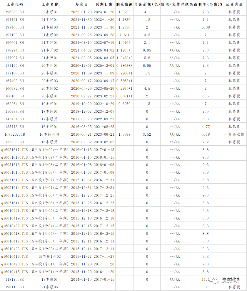豐縣經(jīng)開(kāi)累計(jì)發(fā)行37只債券(產(chǎn)品),其中交易所非公開(kāi)公司債19只、企業(yè)債1只、天交所產(chǎn)品17只。這里的天交所產(chǎn)品名稱為私募債券,對(duì)于這樣的稱呼,筆者以為值得商榷,因此就用產(chǎn)品進(jìn)行了替代。目前,風(fēng)險(xiǎn)經(jīng)開(kāi)存續(xù)的債券有14只,1只企業(yè)債和13只非公開(kāi)公司債。