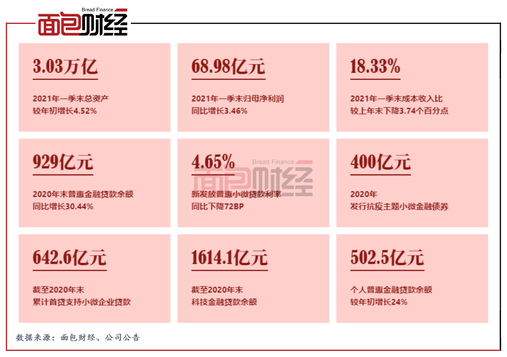 截至2020年末,該行人行口徑普惠金融貸款余額達到929億元,同比增加217億元,增幅達30.44%,增量增速均創(chuàng)近三年新高。新發(fā)放普惠小微貸款利率為4.65%,同比下降72BP。