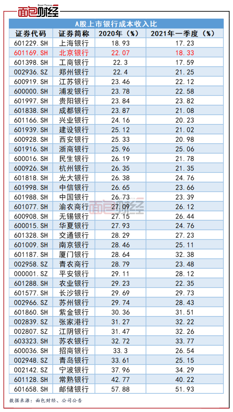 業(yè)績增長的同時,北京銀行加強了成本管理,優(yōu)化了費用結(jié)構(gòu),該行成本收入比持續(xù)下降。2020年,該行的成本收入比為22.07%,較上年同期下降1.16個百分點。2021年一季度,該行的成本收入再次下降3.74個百分點至18.33%。與其他上市銀行相比,北京銀行的成本收入比較低,經(jīng)營效率較高。