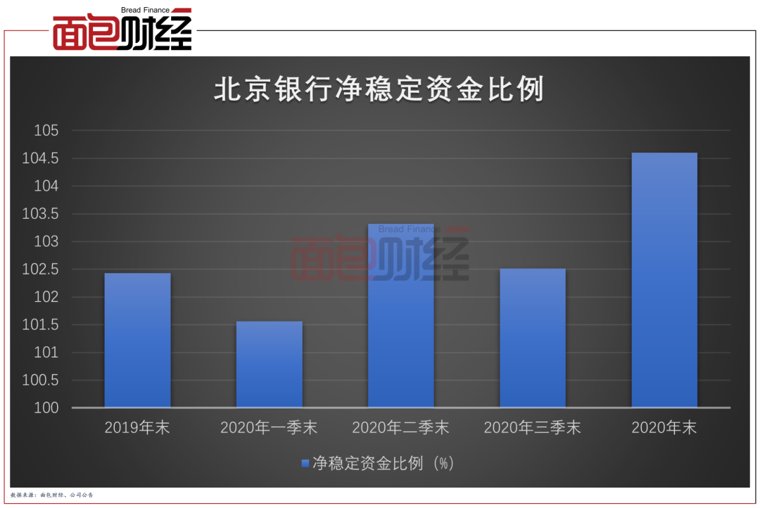 除了資本方面,流動性風(fēng)險管理對于銀行來說也越來越重要。截至2020年末,北京銀行的凈穩(wěn)定資金比例為104.60%,較上年末增加2.17個百分點。