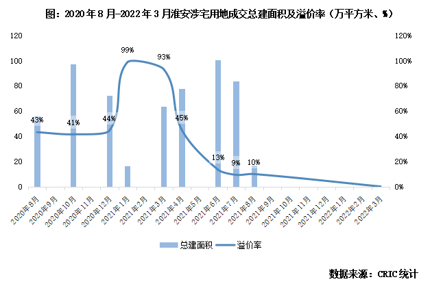 中海7月競得的清江浦區一宗宅地為2021年品牌房企在淮安成交的最后一宗宅地,溢價率降至8%。而2021年一季度融創、弘陽和華潤以溢價率超90%競得三宗宅地,其中弘陽競得的生態商務城泓著大觀項目地塊成交樓面價破萬。兩相對比下,淮安地市降溫可見一斑。