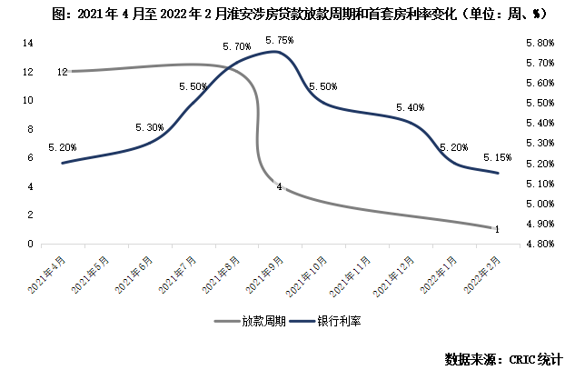 至2022年3月,淮安涉房信貸已寬至近年新低。銀行信貸資金充裕,房貸放寬周期縮短至一周。首套房利率由高點5.75%降至5.15%。