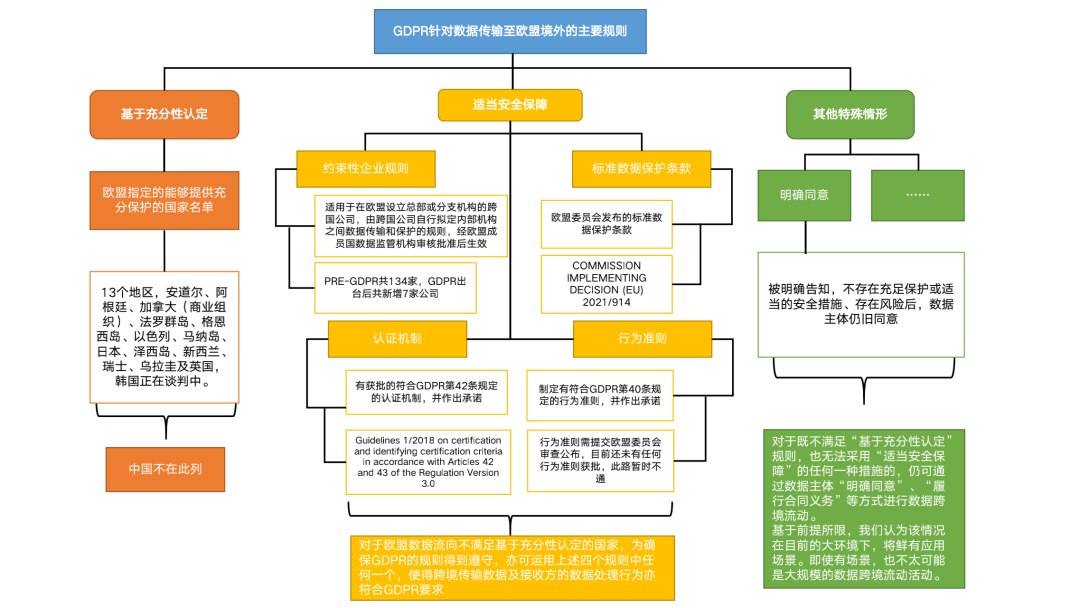 在制度設計層面,歐盟總體而言是鼓勵數據的跨境流動的。因而,GDPR為了規范歐盟公民和居民的數據從歐盟向歐盟外國家和地區流動設立了相應的規則。具體可見如下規則總結圖: