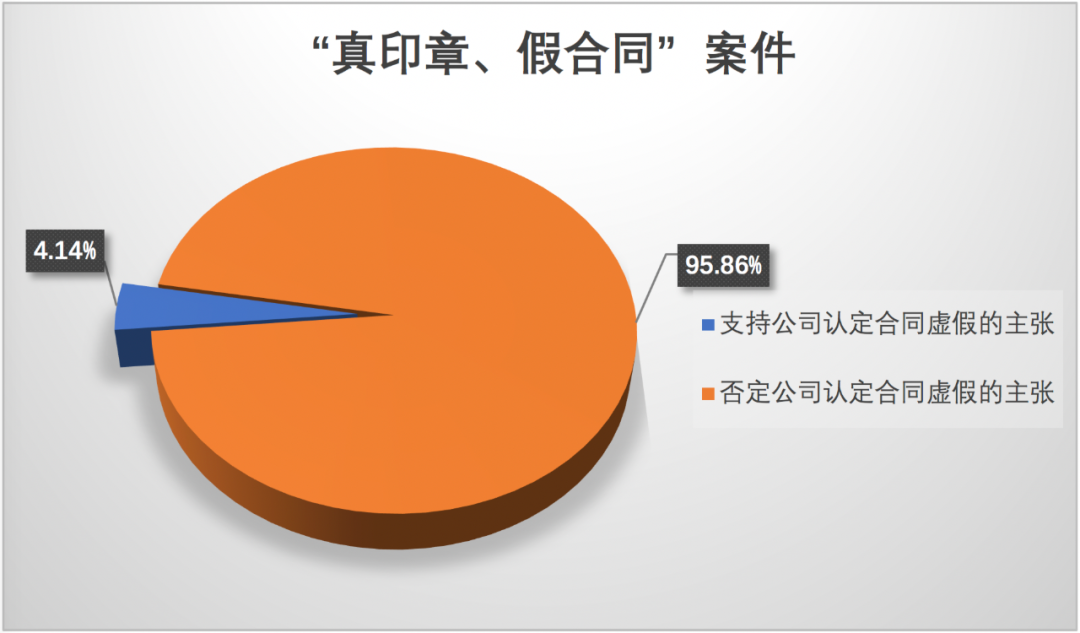 根據筆者檢索的169例“真印章、假合同”案件,僅在7例案件中法院最終支持了公司的主張,認定涉案合同虛假,支持率僅為4.14%。在剩余的162例案件中,法院均以無證據證明或無足夠證據證明為由,否定當事人對涉案合同虛假的主張,并以公司印章真實為由,認定合同內容真實有效。