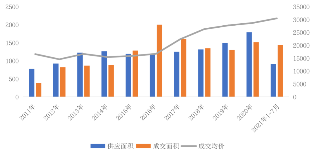 圖:2011年-2021年前7月杭州商品住宅供求量價(單位:萬平方米、元/平方米)