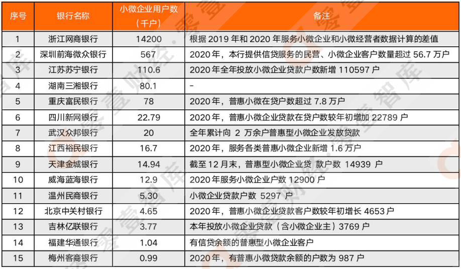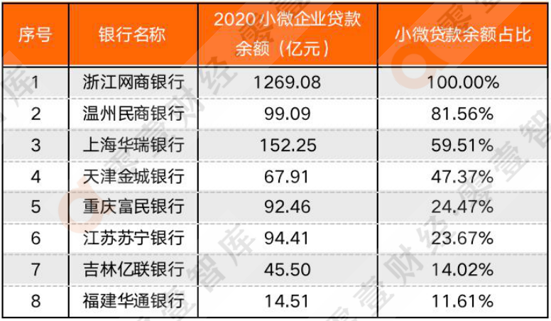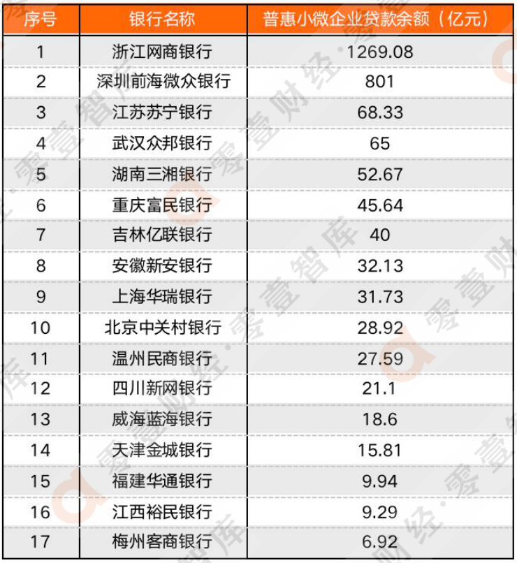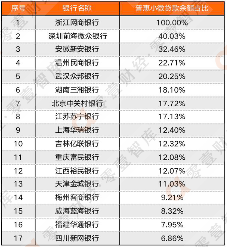 3、 浙江網(wǎng)商銀行和吉林億聯(lián)銀行數(shù)據(jù)來(lái)源于新京報(bào)、溫州民商銀行根據(jù)年報(bào)中“普惠小微貸款余額占比”測(cè)算所得。4、僅限各家銀行表內(nèi)數(shù)據(jù)不含聯(lián)合貸。