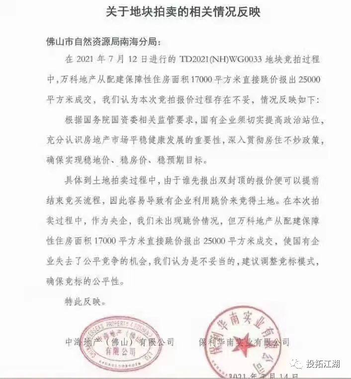 事情的梗概很簡單,就是保利和中海兩家房企,向佛山南海自然資源分局反映情況,話說萬科拿地不講規則,不按套路出牌,導致國有企業沒拿地,讓國企喪失了公平競爭的機會。
