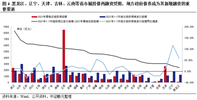 由于城投公司普遍存在自身造血能力較弱,債務償還主要依賴于當地財政資金注入以及借新還舊,城投公司債務再融資順暢則可及時獲取資金來償還到期債務,降低信用風險事件的發生概率。我們從城投債的發行規模與需償還規模的比值來看各區域城投公司債券的再融資能力,浙江、山東、江西、四川等省份靠前,其中浙江達到181.82%,其他發債大省中湖南、江蘇分別為103.39%和100.59%;而東北三省、天津、寧夏、甘肅、云南等省份該比值較低,城投債再融資受阻。對于城投債再融資能力較弱的區域,地方政府債券成為其新增融資的重要渠道,2021年1-7月遼寧、黑龍江、天津地方政府債券發行規模分別增加了949.88億元、458.84億元及195.88億元,同比增速分別為116.53%、58.49%及20.85%。