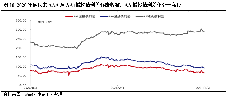 2021年以來全國城投債利差總體有一定收窄,但區域之間利差走勢繼續分化