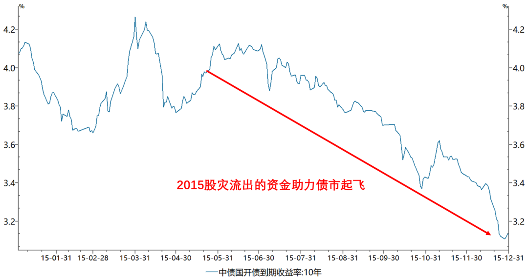 2015股市的大跌使得資金迅速投向固收市場避險,股債蹺蹺板效應明顯。在股市流出資金的帶動下,債券市場結(jié)束調(diào)整,10年期國開債迎來了一波100bp的大牛市。