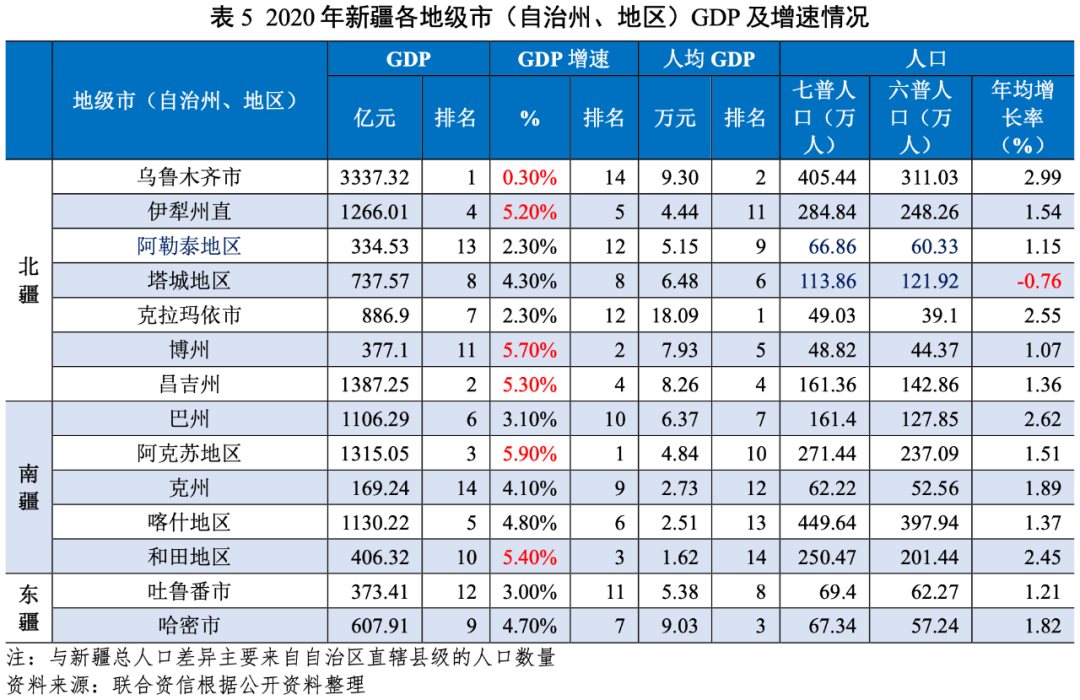 從GDP增速看,2020年,新疆各地級市(自治州、地區)GDP增速差別較大,其中經濟總量最高的烏魯木齊市GDP增速僅為0.3%,伊犁州直、博州、昌吉州、阿克蘇地區、和田地區2020年GDP增速相對較高,介于5~6%之間。