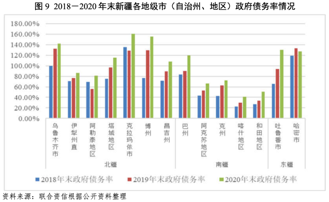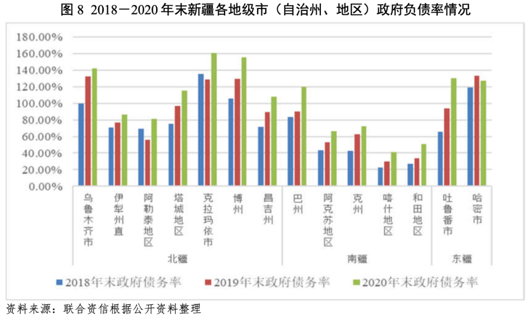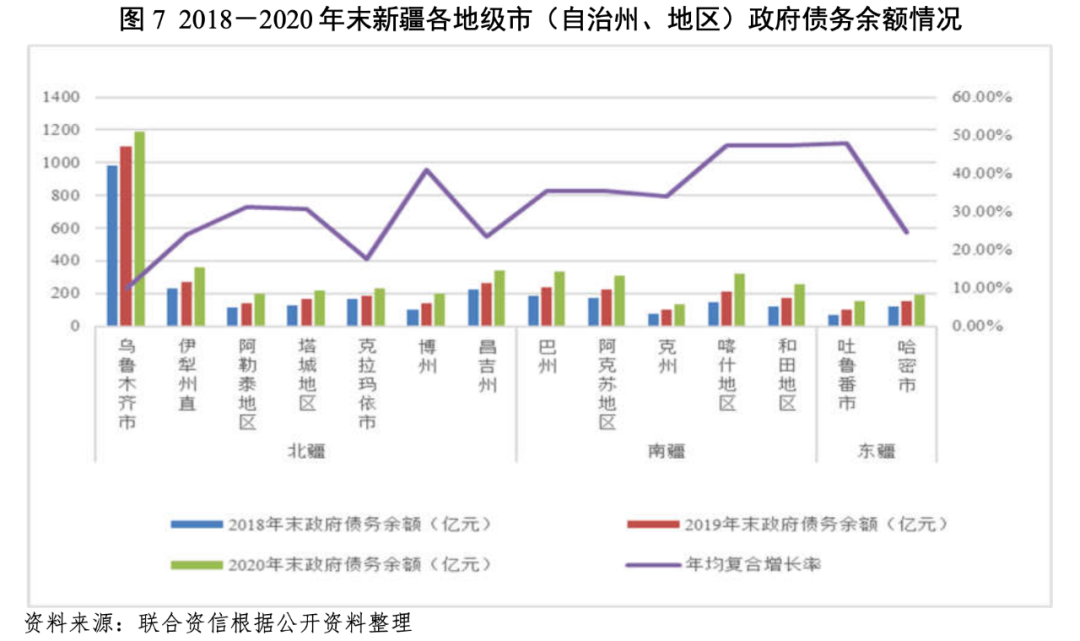 從各地區債務負擔看,“發債城投企業全部債務+地方政府債務”/GDP的比值相對較高的地級市(自治州、地區)分別為烏魯木齊市、伊犁州直、阿勒泰地區、博州、克州以及和田地區,均超過50%,債務負擔重。