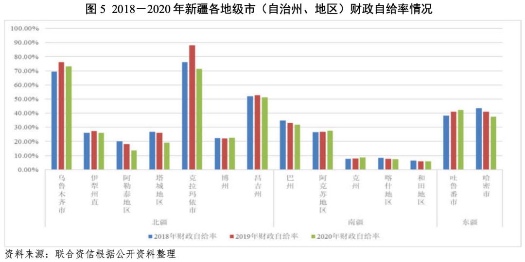 財政自給率[2]方面,烏魯木齊市和克拉瑪依市的財政自給程度較高,為70%左右;昌吉州2018-2020年財政自給率維持在52%左右;新疆其余地級市(自治州、地區)的財政自給程度較低,不足45%。