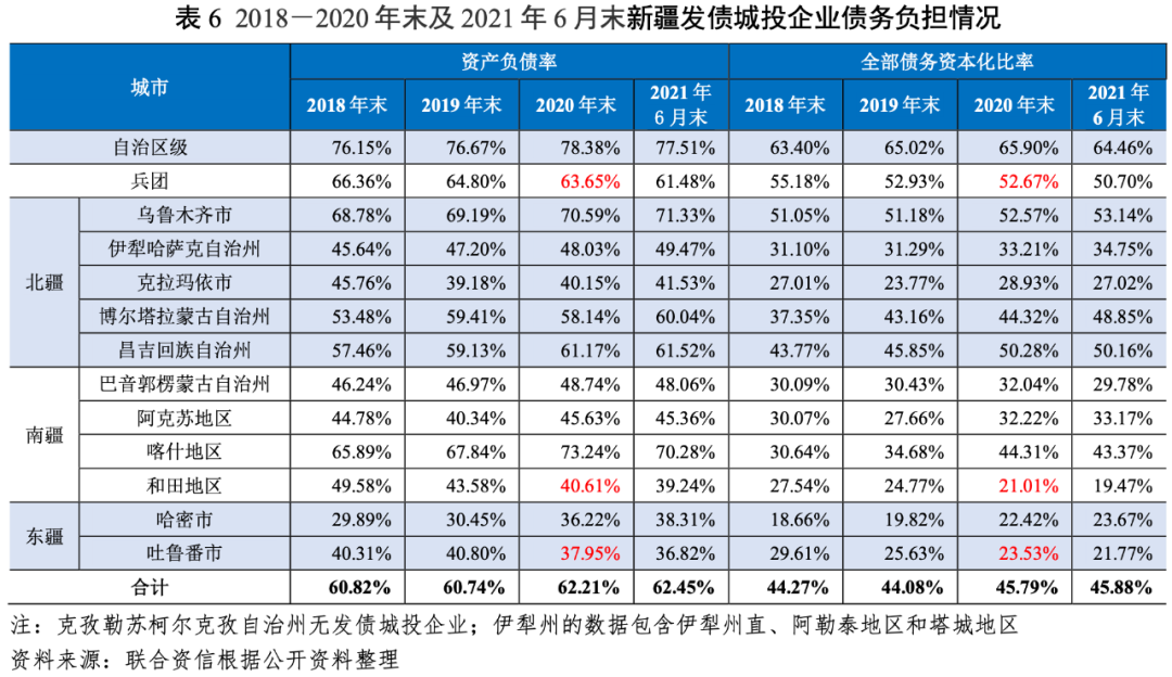 截至2021年6月末,自治區級、喀什地區和烏魯木齊市發債城投企業資產負債率均在70%以上,省級、兵團、烏魯木齊市和昌吉州發債城投企業全部債務資本化比率均在50%以上,債務負擔相對較重。