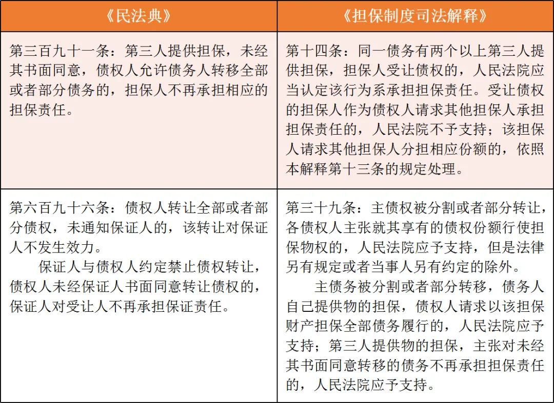 (1)債權(quán)債務(wù)轉(zhuǎn)移免責(zé):在主從關(guān)系之下,債權(quán)人與擔(dān)保權(quán)人屬于同一人,主債權(quán)轉(zhuǎn)讓僅涉及債權(quán)人的變化,對主債務(wù)人的履約能力不產(chǎn)生影響,一般不會(huì)增加擔(dān)保人的風(fēng)險(xiǎn)和負(fù)擔(dān),因此,未履行通知義務(wù)情況下,該轉(zhuǎn)讓對保證人不發(fā)生效力。主債務(wù)的轉(zhuǎn)移涉及履行主債務(wù)的義務(wù)人的變化,擔(dān)保人基于對原債務(wù)人的履約能力為主債務(wù)的履行提供擔(dān)保,承擔(dān)人是否如原債務(wù)人一樣具有相應(yīng)的履約能力,擔(dān)保人在提供擔(dān)保時(shí)不能預(yù)估。因此,主債務(wù)的轉(zhuǎn)移關(guān)涉擔(dān)保人利益,未經(jīng)擔(dān)保人同意的主債務(wù)轉(zhuǎn)移雖可在當(dāng)事人之間發(fā)生效力,但不得對擔(dān)保人主張,擔(dān)保人在轉(zhuǎn)移的主債務(wù)范圍內(nèi)免除擔(dān)保責(zé)任。第三人提供物的擔(dān)保,其可以主張對未經(jīng)其書面同意轉(zhuǎn)移的債務(wù)不再承擔(dān)擔(dān)保責(zé)任。若保證人與債權(quán)人已經(jīng)約定禁止債權(quán)轉(zhuǎn)讓,債權(quán)人未經(jīng)保證人書面同意轉(zhuǎn)讓債權(quán)的,保證人對受讓人不再承擔(dān)保證責(zé)任。