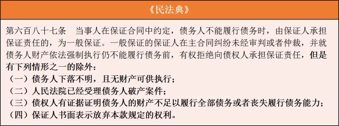 (1)未先執(zhí)行債務(wù)人財(cái)產(chǎn)免責(zé):一般保證人專屬有先訴抗辯權(quán),是指一般保證的保證人在就債務(wù)人的財(cái)產(chǎn)依法強(qiáng)制執(zhí)行仍不能履行債務(wù)前,對債權(quán)人可以拒絕承擔(dān)保證責(zé)任的權(quán)利,法律同時(shí)也設(shè)定了限制一般保證人行使先訴抗辯權(quán)的情形,此次《民法典》對一般保證人不得行使前款權(quán)利的情形做了較大調(diào)整。法條鏈接: